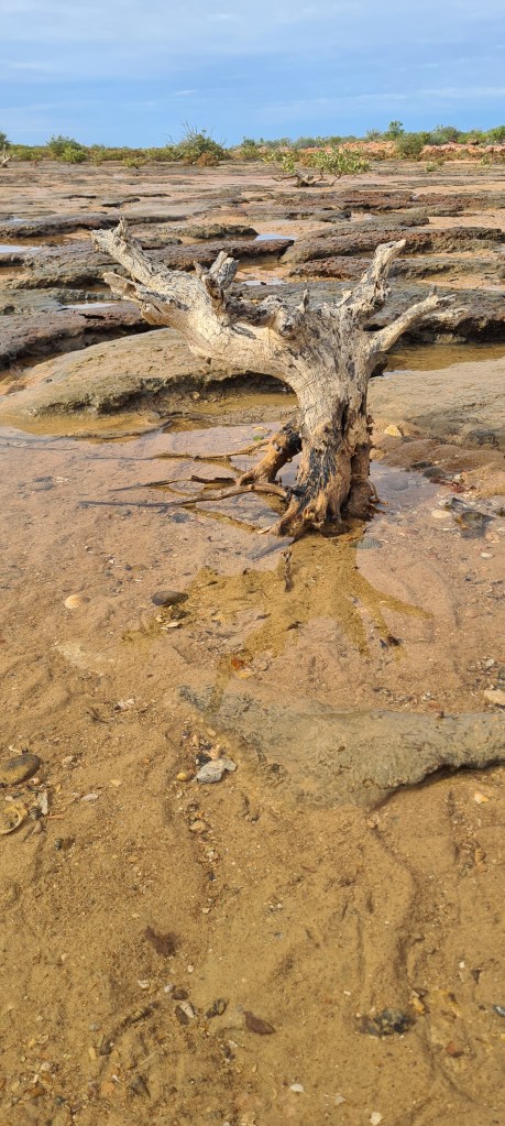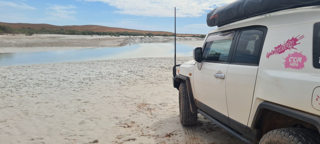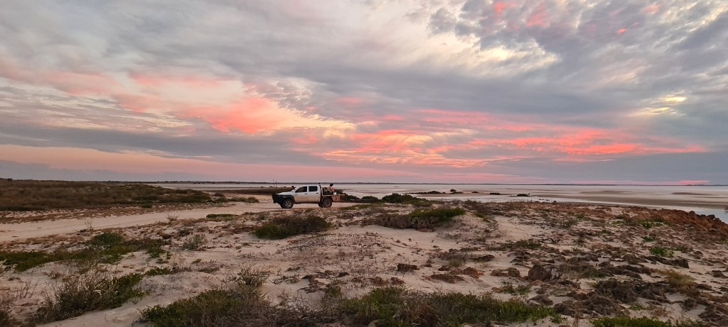Wednesday is ‘damper nights’, damper is cooked at the communal fire pit by John and then shared around. It’s a great way to meet people and chat about travels. I met a lovely family on their gap year travelling Australia, Wendy and Dan and their 3 kids Matilda, Lauren and Zara. We chatted a while and made plans to catch the high tide the following morning at 8am at Exmouth Gulf. It is still part of the property, just outside the main entrance and you find the gate on your right and its about 20ks down the track. Now this track has a little of everything, great scenery, soft sand, hard sand, corrugations and some rocky parts. All in all a great drive and I am glad I wasn’t doing it solo. I gave the family my 2way so we could chat if needed.