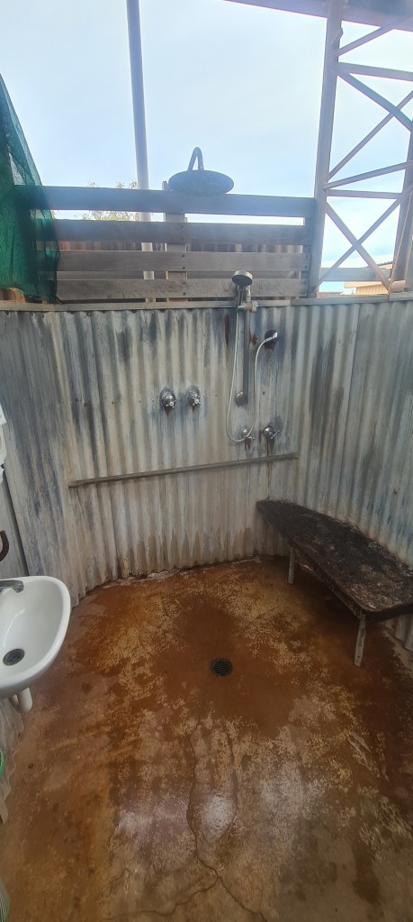 The facilities were good, simple and absolutely NO TREES in sight but showers were good pressure! It was a very desolate camp grounds quite literally the ablutions, bitumen and grass. Slept like a log, and it bucketed down with rain! Got woken a couple times with the rain but slept well. Bit of a break in the rain in the morning so packed up when I could, went tent but kinda better than a wet me. The tent will dry out at the next stop.