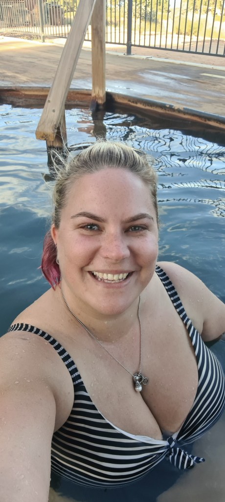 Now this station is known for 3 things, an awesome tip, a pretty cool river that flows upside down and 4 hot pools running at 33 degrees 24/7. So once I had set the tent up, I changed into bathers and headed off to find these pools. OMG they didn’t disappoint and to start with I had a whole pool to myself! They were like an oversized warm bath with epsom salts already in it! Absolutely amazing! I chatted briefly to the maintenance man at this point. A couple of couples joined me after about half hour and was great talking to them all, we didn’t exchange names but they were all super friendly. I met my neighbours briefly, a lovely couple camping with a tent and Britz 4wd ute, they let me know there was music up at the communal fire pit, so I headed up to listen at about 6pm. It definitely wasn’t my scene or music, so I didn’t stay long.