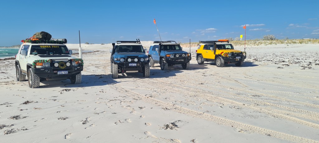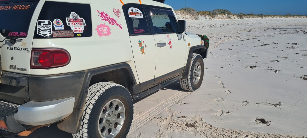 I have been a part of the Perth FJ Cruisers on FB since purchasing Mallow 3.5yrs ago and been to the Christmas run twice now. Christmas 2022 was Lancelin in the dunes, unfortunately I was running late (literally getting my hair done) so I didn’t get to Lancelin till after lunch, they had already finished in the dunes. We met in town as we were headed to Wedge for the afternoon. I was yet to air down so we headed to the dunes so I could do so.